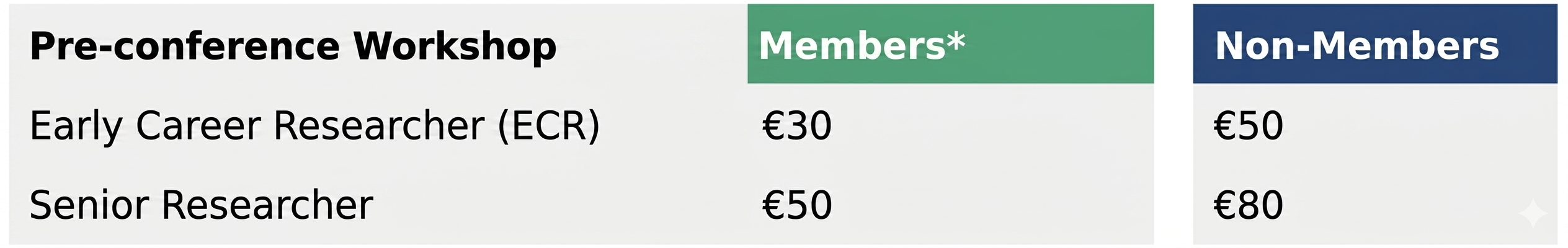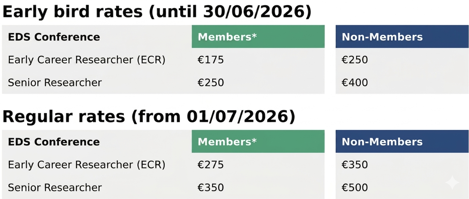 | Early Career Researcher* events (ECR)* | 175 EUR | 250 EUR | Early career researcher (ECR)* | 275 EUR | 350 EUR |
